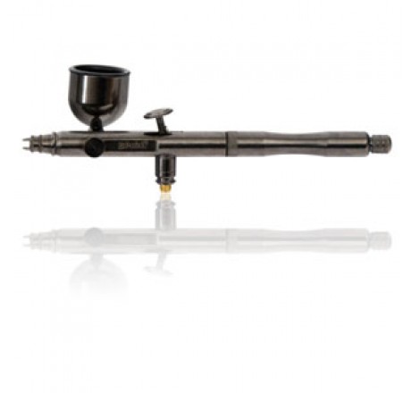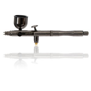 Badger Spirit Airbrush — The Spirit is a side-feed, internal mix, dual-action airbrush with a 6° needle point angle and a .21 mm paint tip (hairline to 1”). This set includes the following parts and accessories: * A Badger Spirit Airbrush * An additional regulator * A side-feed color cup with cap * An attachable 1 oz glass jar with metal adapter cup * An Iwata style hose adapter that lets you use a regular 1/8 hose.