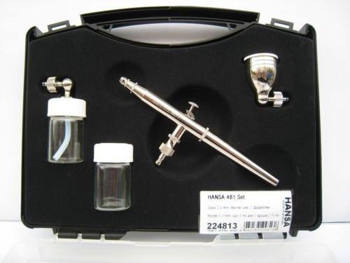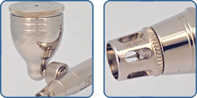 Airbrush set with side fitting connector, 7 ml top-mounted flow cup (with lid) and side fitting connector set with two glass cups (15 ml), 0.3 mm socket-type nozzle system, adaptable for 0.2 and 0.4 mm. Variable design ideal for universal applications in all areas. "The optimum set for model constructors".