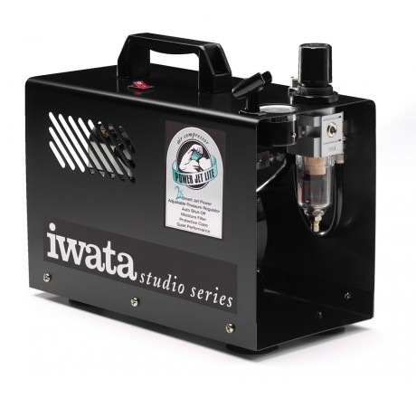 Featuring the powerful twin-pump, 1/6 Hp motor, the Power Jet Lite compressor is equipped with a pressure regulator for precise adjustment of airflow. Built with Iwata’s Smart Technology, it automatically shuts off when not in use. Economically priced, the Power Jet Lite doesn’t have a tank reservoir, yet delivers all the power necessary for use with the high-paint-flow, multi-purpose Iwata Eclipse airbrush and the new Eclipse G6 pistol grip airbrush. Like all Iwata Studio Series compressors, the Power Jet Lite comes complete with an airhose and adapters so it can hook up to any brand of airbrush.